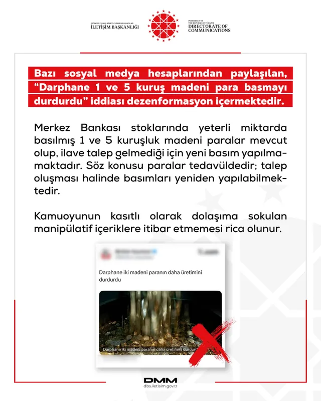Dezenformasyonla Mücadele Merkezi, sosyal medyada yer alan "Darphane 1 ve 5 kuruş madeni para basmayı durdurdu" iddiasının gerçeği yansıtmadığını açıkladı. Banka stoklarında yeterli miktarda madeni para bulunduğu belirtilen açıklamada, talep gelirse yeniden basılabileceğini kaydetti.