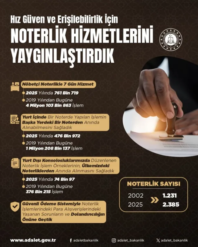 Adalet Bakanı Yılmaz Tunç, 2025 yılında noterlik hizmetlerinde önemli gelişmeler yaşandığını ve hem yurt içi hem de yurt dışı işlemlerde yüzbinlerce işlemin hayata geçirildiğini açıkladı.