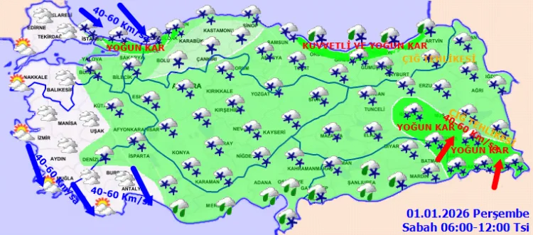 Akdeniz kıyılarında yağmur ve sağanak, diğer yerlerde karla karışık yağmur ve kar şeklinde görülecek yağışların; Doğu Karadeniz kıyıları, Doğu Anadolu'nun güneydoğusu ile Sakarya, Düzce, Zonguldak, Bartın, Ordu, Gümüşhane, Erzincan, Tunceli, Bingöl, Muş, Batman ve Siirt çevrelerinde kuvvetli ve yoğun kar şeklinde olması bekleniyor.