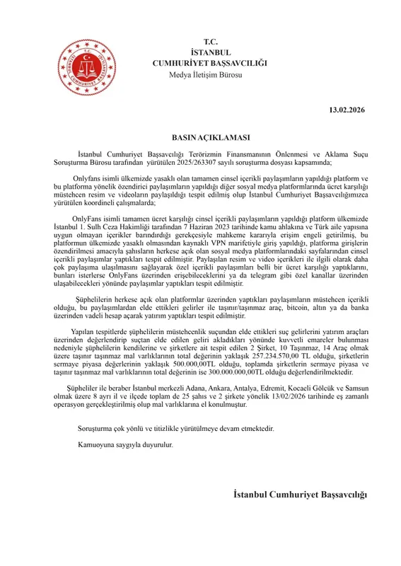 İSTANBUL (İGFA) - İstanbul Cumhuriyet Başsavcılığı Terörizmin Finansmanının Önlenmesi ve Aklama Suçu Soruşturma Bürosu tarafından yürütülen 2025/263337 sayılı soruşturma kapsamında, kamuoyunda "OnlyFans soruşturması" olarak bilinen dosyada önemli bir operasyon gerçekleştirildi.
