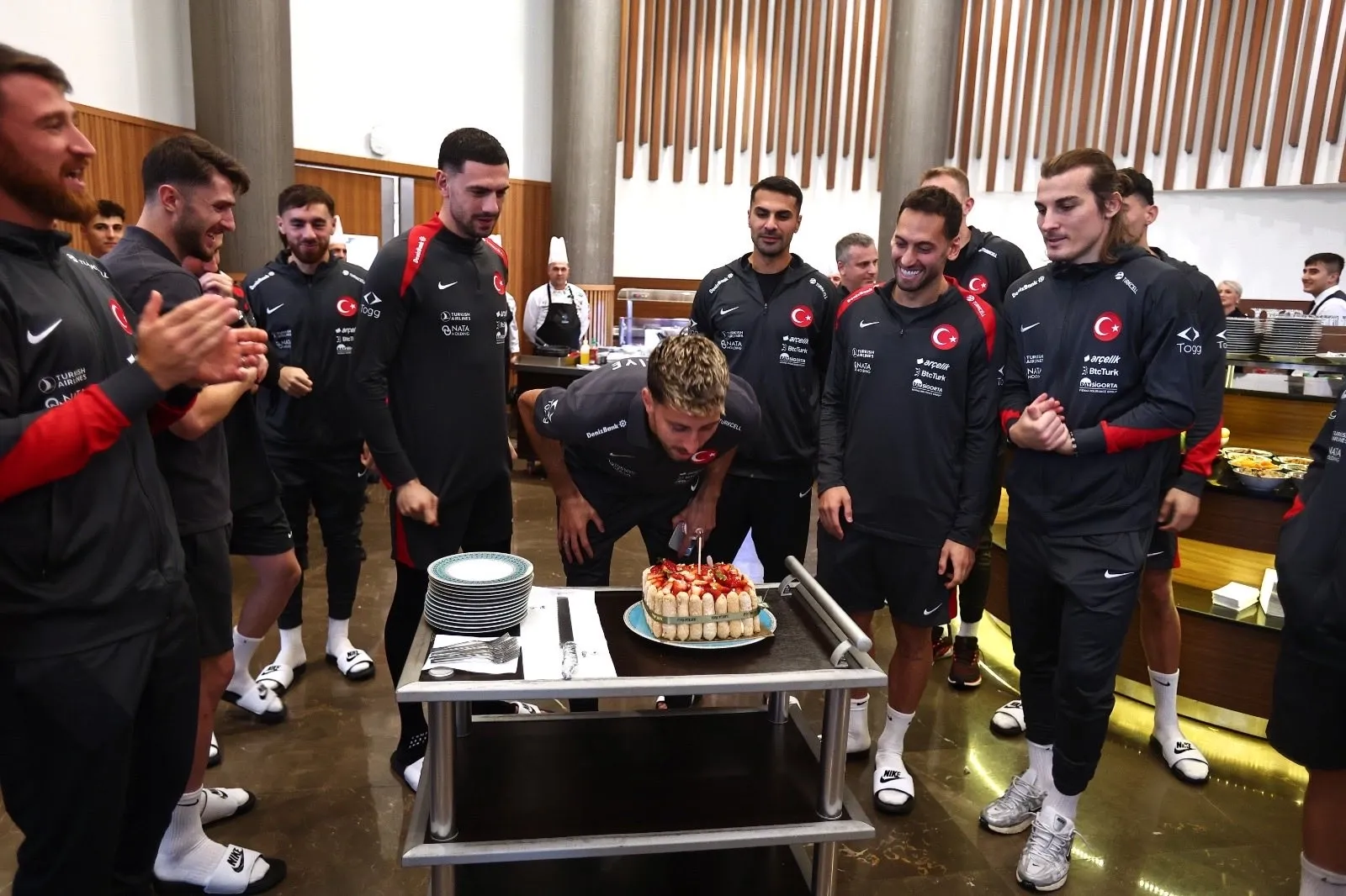 A Millî Takım'ın 2026 Dünya Kupası Avrupa Elemeleri için Riva'da kamp yaptığı sırada, aday kadroda yer alan oyuncumuz Atakan Karazor'un doğum günü coşkuyla kutlandı. Öğle yemeği sonrası hazırlanan pastayı kesen Atakan'a ilk dilimi kaptan Hakan Çalhanoğlu ikram etti.