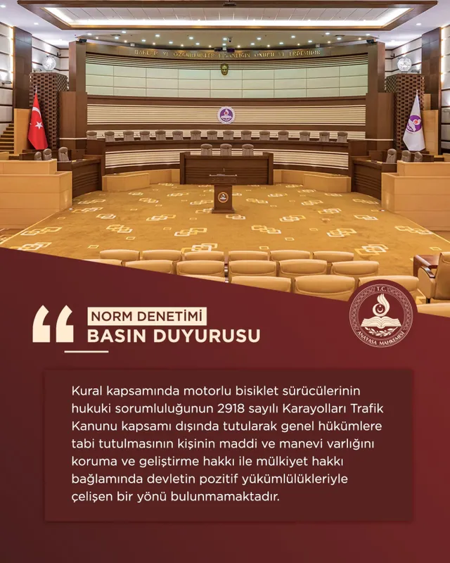 Anayasa Mahkemesi, 2918 sayılı Karayolları Trafik Kanunu'nda motorlu bisiklet sürücülerinin hukuki sorumluluğunun genel hükümlere tabi olduğunu öngören düzenlemenin Anayasa'ya aykırı olmadığına hükmetti.