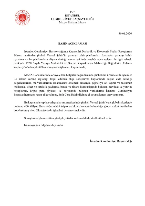 İstanbul'da yasadışı bahis soruşturmasında, 'bahis baronu' olark bilinen Veysel Şahin'in yasadışı bahis oynattığı ve kara para akladığı belirlenerek, şüphelinin mal varlıklarına el konuldu. 460 milyon Euro değerindeki kripto varlıkları ise donduruldu. Soruşturma sürüyor.