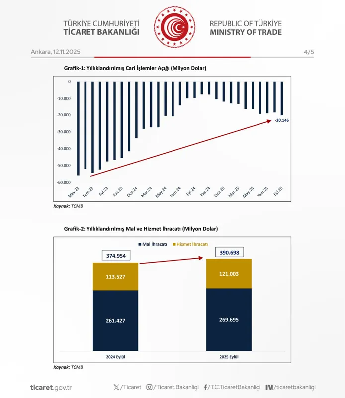 Ticaret Bakanı Ömer Bolat, TCMB'nin eylül ayı ödemeler dengesi verilerini değerlendirdi. Bakan Bolat, hem mal hem hizmet ihracatında güçlü artış kaydedildiğini ve cari işlemler dengesinin istikrarını koruduğunu açıkladı.
