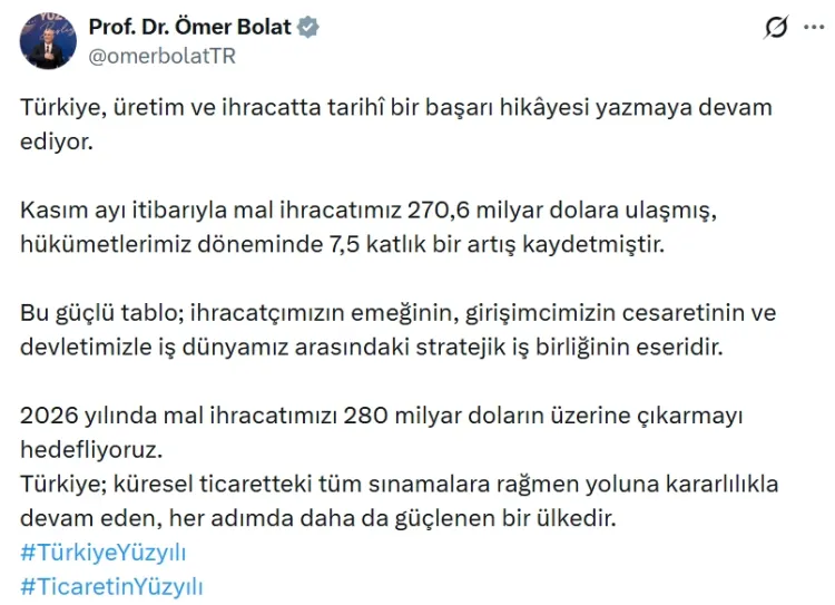 Ticaret Bakanı Ömer Bolat, Türkiye'nin ihracat performansına ilişkin dikkat çeken verileri paylaşarak, Kasım itibarıyla mal ihracatının 270,6 milyar dolara ulaştığını ve 2026 hedefinin 280 milyar doların üzerine çıkmak olduğunu açıkladı.