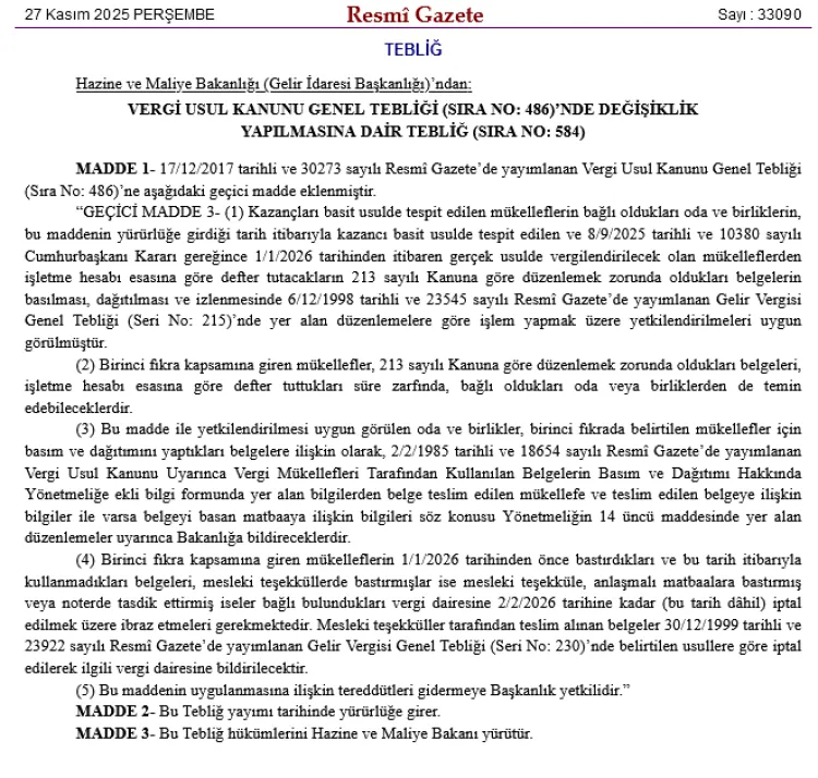 Bugünkü Resmi Gazete'de yayımlanan tebliğ değişikliğiyle, 1 Ocak 2026'dan itibaren gerçek usulde vergilendirilecek basit usul mükelleflerin belge basım ve dağıtım süreçlerinde oda ve birliklere yeni yetkiler tanındı.
