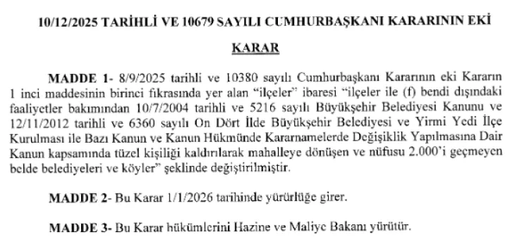Kararın 1. maddesinin birinci fıkrasında yer alan "ilçeler" ibaresi, "ilçeler ile (f) bendi dışındaki faaliyetler bakımından 10/7/2004 tarihli ve 5216 sayılı Büyükşehir Belediyesi Kanunu ve 12/11/2012 tarihli ve 6360 sayılı On Dört İlde Büyükşehir Belediyesi ve Yirmi Yedi İlçe Kurulması ile Bazı Kanun ve Kanun Hükmünde Kararnamelerde Değişiklik Yapılmasına Dair Kanun kapsamında tüzel kişiliği kaldırılarak mahalleye dönüşen ve nüfusu 2.000'i geçmeyen belde belediyeleri ve köyler." olarak değiştirildi.