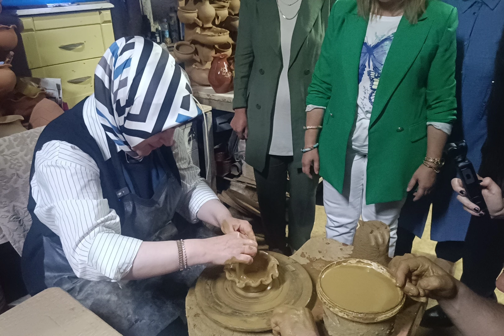 AK Parti Genel Merkez Kadın Kolları Başkanı Tuğba Işık Ercan, Bilecik'in Pazaryeri ilçesinde çömlek çarkının başına geçerek, kendi çömleğini yapan kadın girişimcilerin alın terine ortak oldu.