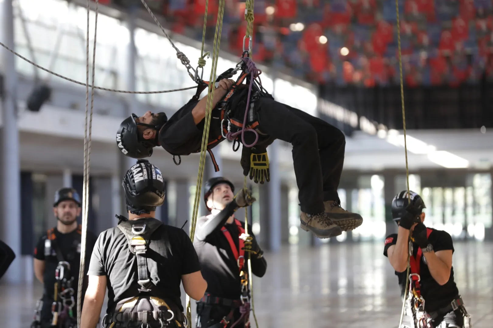 Merinos Yerleşkesi Fuaye Alanı'nda 'İple Kurtarma Sistemleri ve Arama-Kurtarma eğitimi' alan ekipler, uzman eğitmenler eşliğinde tavana asılı halatlara güvenlik ekipmanlarını kullanarak tırmandı.