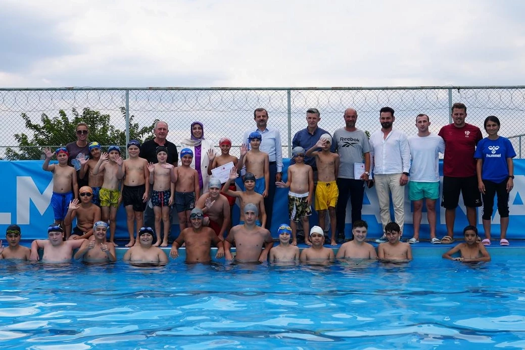Bursa'da Gürsu Belediyesi'nin her yıl yaz döneminde açtığı havuz sezonunda eğitim gören minik yüzücüleri, bu yıl da sertifika dağıtarak mezun etti.