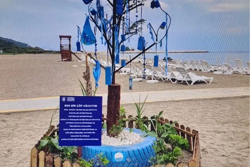 Karacabey Kurşunlu Halk Plajı'ndaki temizlik çalışmasında toplanan çöp ve atıklar, vatandaşlar tarafından boyanarak geri dönüşüm temalı çöp ağacına dönüştürüldü.