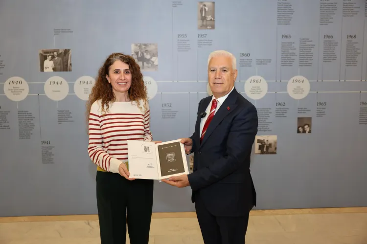 Ziyaretin sonunda Başkan Mustafa Bozbey, sergiye katkılarından dolayı Küratör Yasemin Bay'a hediye verdi.