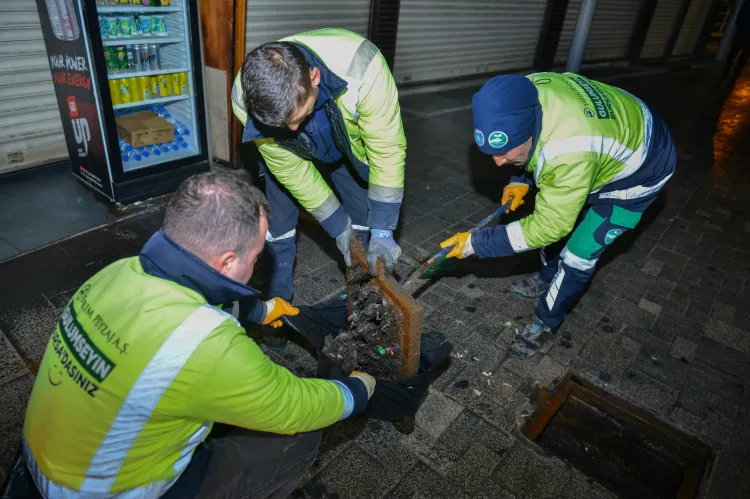 Yaya trafiğinin yoğun olarak yaşandığı Kapalıçarşı bölgesinde gece saatlerinde yoğun mesai harcayan Büyükşehir Belediyesi ekipleri, mazgalları tek tek açarak biriken kâğıt, yaprak, izmarit, kum, taş gibi atık ve yabancı maddeleri topladı.
