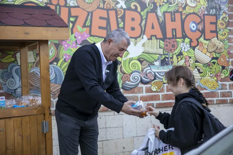 Başkan Günay, "Güzelbahçe'de yaşayan çiftçilerimizin mandalinaları bu sene yine dalında kaldı para etmediği için köylümüz bunları toplayamadı biz de köylümüzün malını alarak ilçemizde bulunan devlet okullarına her gün dağıttığımız simit ve poğaçanın yanında bugün de mandalina dağıtıyoruz. Köylü satamadı biz de onları alıp buradaki çocuklarımıza dağıtıyoruz" diye konuştu.