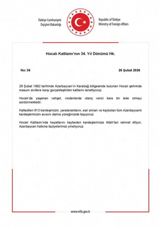 Dışişleri Bakanlığı, Hocalı Katliamı'nın yıl dönümünde yaptığı açıklamada, 26 Şubat 1992'de hayatını kaybeden 613 Azerbaycan vatandaşı için rahmet diledi, Azerbaycan halkına taziyelerini iletti.