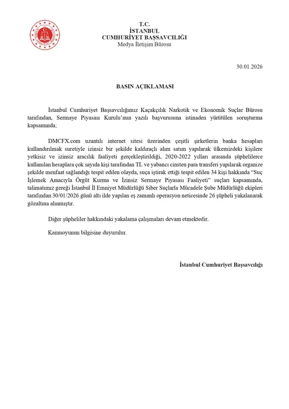 İstanbul Cumhuriyet Başsavcılığı Kaçakçılık, Narkotik ve Ekonomik Suçlar Bürosu tarafından yürütülen soruşturma kapsamında, DMCFX.com uzantılı internet sitesi üzerinden izinsiz kaldıraçlı alım-satım işlemleri yapıldığı ve yetkisiz sermaye piyasası faaliyeti gerçekleştirildiği tespit edildi.