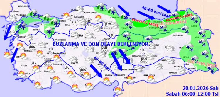 Rüzgârın; Marmara'nın güneybatısı, Kuzey Ege, Orta ve Doğu Karadeniz kıyıları, İç Anadolu'nun güneydoğusu ve Doğu Akdeniz'in iç kesimlerinde kuzeyli yönlerden 40-60 km/saat hızla kuvvetli esmesi öngörülürken, gece ve sabah saatlerinde iç ve doğu bölgelerde buzlanma, don, pus ve sis bekleniyor. Hava sıcaklıklarının batı kesimlerde 3 ila 5 derece artacağı, diğer bölgelerde ise önemli bir değişiklik olmayacağı bildirilirken, Doğu Karadeniz'in yüksekleri ile Doğu Anadolu'nun doğusunda çığ tehlikesi bulunuyor.