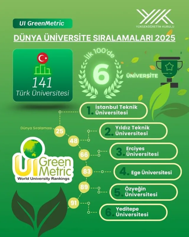 Dünya genelinde 105 ülkeden 1745 üniversitenin değerlendirildiği UI GreenMetric 2025 sıralamasında Türkiye'den 141 üniversite yer aldı, 6'sı ilk 100 içine girmeyi başardı. YÖK Başkanı Erol Özvar, söz konusu sonuçların, üniversitelerin yeşil dönüşümdeki kararlılığını gösterdiğini söyledi.
