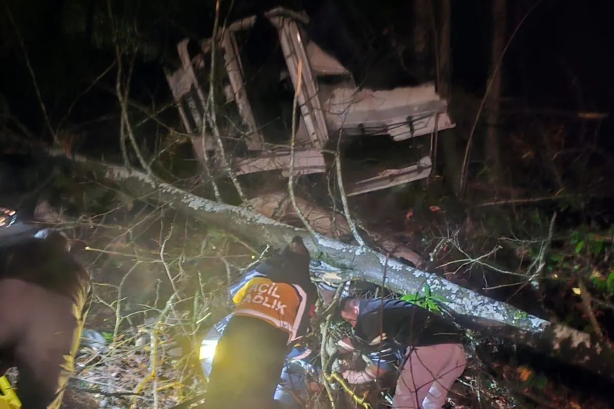 Düzce'nin Yığılca ilçesinde, Pasabükü Orman İşletme Deposundan tomruk yükleyen bir tır, Kavuktaş mevkisinde uçuruma yuvarlandı.