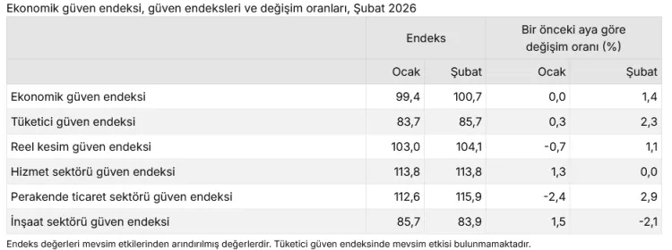 Şubat'ta Ekonomik Güven Endeksi yüzde 1,4 artışla 100,7'ye yükseldi. Tüketici güveni yüzde 2,3 artarken, inşaat sektörü güveni yüzde 2,1 azaldı.