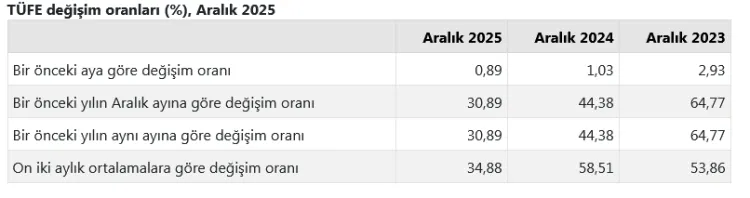 Öte yandan Enflasyon Araştırma Grubu (ENAG), 2025 Aralık ayına ilişkin E-TÜFE verilerine göre de, E-TÜFE, Aralık ayında bir önceki aya göre yüzde 2.11 oranında arttı. Yıllık enflasyon artış oranı ise yüzde 56.14 olarak hesaplandı.