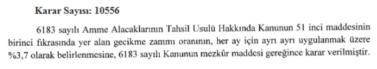 ANKARA (İGFA) - Resmi Gazete'nin bugünkü sayısında yer alan Cumhurbaşkanı Kararı ile, 6183 sayılı Amme Alacaklarının Tahsil Usulü Hakkında Kanun'un 51'inci maddesi kapsamında uygulanan gecikme zammı oranı, her ay için ayrı ayrı uygulanmak üzere yüzde 3,7 olarak belirlendi.