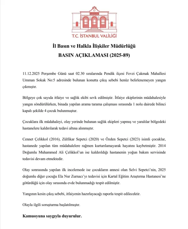 İstanbul'un Pendik ilçesinde Fevzi Çakmak Mahallesi'nde çıkan yangında 4 çocuk yaralandı; 3'ü hayatını kaybetti, 1'inin tedavisi yoğun bakımda sürüyor.