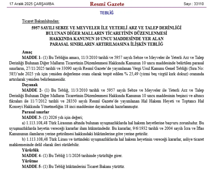 ANKARA (İGFA) - Ticaret Bakanlığı, 5957 sayılı Sebze ve Meyveler ile Yeterli Arz ve Talep Derinliği Bulunan Diğer Malların Ticaretinin Düzenlenmesi Hakkında Kanun uyarınca, 2026 yılında geçerli olacak parasal sınırları Resmî Gazete'de yayımlanan tebliğ ile açıkladı.