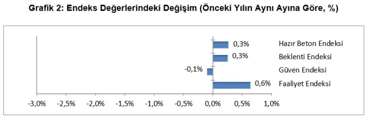 Kasım ayında endeksler bir önceki aya göre belirgin bir değişim göstermedi; Faaliyet Endeksi yüzde 0,6, Hazır Beton ve Beklenti Endeksleri ise yüzde 0,3 oranında artarken, Güven Endeksi yüzde 0,1 gerileyerek tek negatif endeks oldu.
