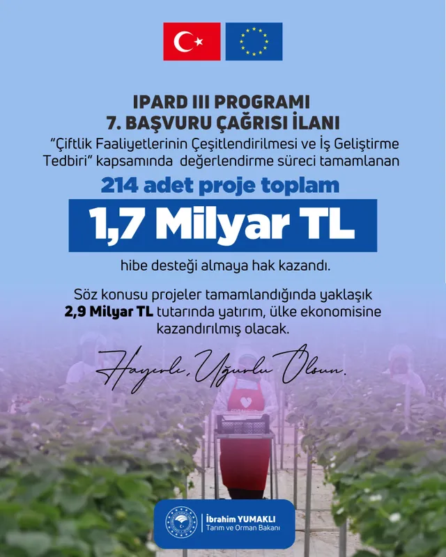 Bakan Yumaklı, sosyal medya hesabından yaptığı paylaşımda, IPARD projeleri sayesinde 214 girişimcinin yatırımlarını hayata geçirme yolunda önemli bir adım attığını belirterek, projelerin tamamlanmasıyla birlikte yaklaşık 2,9 milyar TL tutarında yatırımın ülke ekonomisine kazandırılacağını ifade etti.