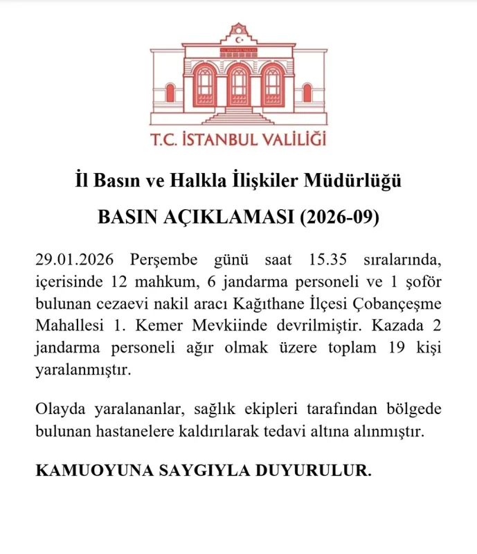 İSTANBUL (İGFA) - İstanbul Valiliği, Kağıthane ilçesinde cezaevi nakil aracının karıştığı trafik kazasına ilişkin yazılı açıklama yaptı.
