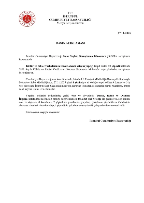 İstanbul Cumhuriyet Başsavcılığı koordinasyonunda düzenlenen operasyonda, Yunan, Roma ve Osmanlı dönemlerine ait olduğu değerlendirilen 286 tarihi eser ele geçirilirken 12 şüpheliden 7'si gözaltına alındı. Yakalama kararı bulunan 1 kişinin aranmasına devam ediliyor.