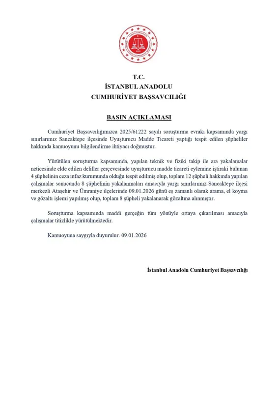 İstanbul Anadolu Cumhuriyet Başsavcılığı, Sancaktepe merkezli yürütülen uyuşturucu soruşturmasında 8 şüphelinin gözaltına alındığını açıkladı.