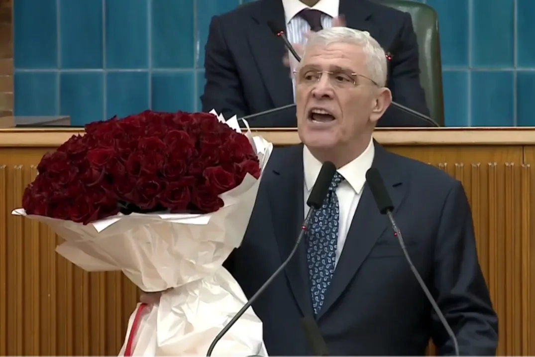 İYİ Parti Genel Başkanı Müsavat Dervişoğlu, Orta Doğu'daki gelişmelere dikkat çekerek, bölgede rejim değişikliği amaçlı egemenlik mühendisliği yapıldığını, Batı'nın çifte standart uyguladığını savundu. İran'daki olası bir çöküşün Türkiye'yi etkileyeceğini, yeni göç dalgası riskine karşı uyarıda bulunan Dervişoğlu, Cumhurbaşkanı Erdoğan'a zirve çağrısı yaparak, kürsüden üç ayrı demet halinde 308 gül gönderdi.