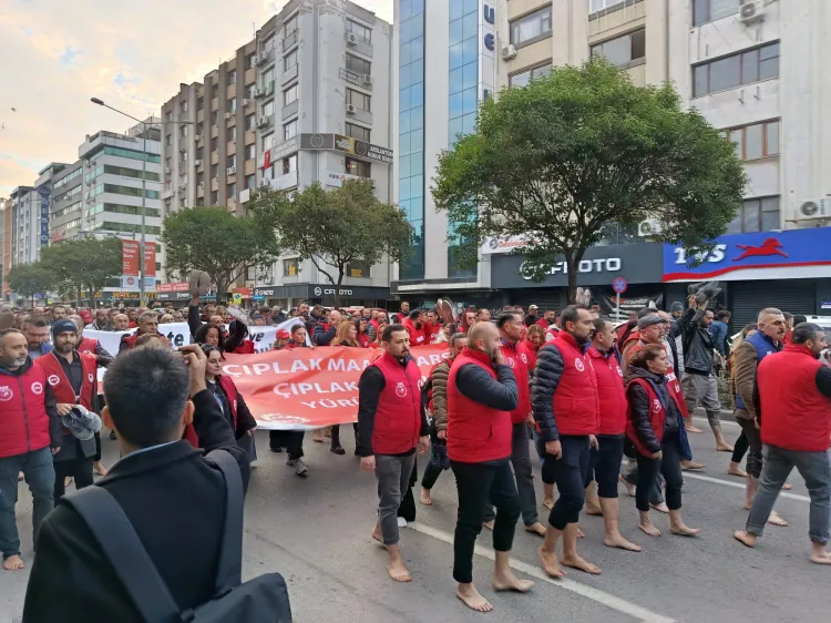 İzmir Büyükşehir Belediyesi'ne bağlı İZENERJİ, İZELMAN, İZFAŞ, EGEŞEHİR ve İZTEK çalışanları, aylardır ödenmeyen yan haklar ve "çıplak ücret" uygulamasına karşı bugün tarihi bir eyleme imza attı. DİSK/Genel-İş 1, 2, 3 ve 9 No'lu Şubelerin çağrısıyla 23 bin işçi, yalın ayak yürüyüş gerçekleştirerek tepkisini ortaya koydu.