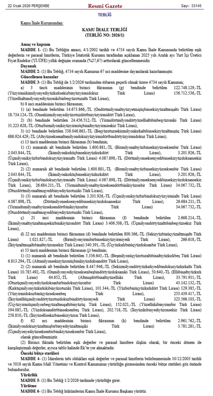 Kamu İhale Kurumu tarafından hazırlanan Kamu İhale Tebliği, Resmî Gazete'de yayımlandı. Tebliğ ile kamu ihalelerinde uygulanan eşik değerler ve parasal limitler, Yİ-ÜFE oranında artırılarak 1 Şubat 2026'dan itibaren geçerli olacak şekilde güncellendi.