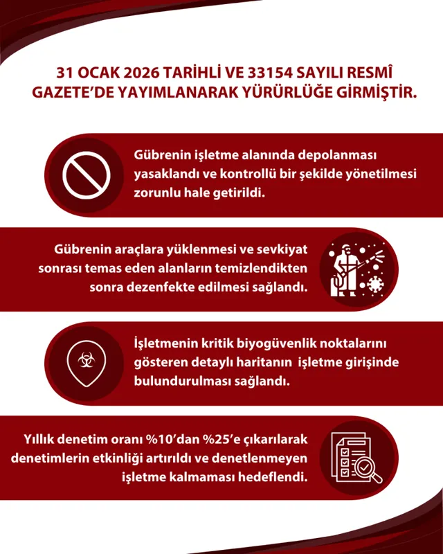 Yeni tebliğ ile işletme giriş-çıkışları, araç ve personel hareketleri, yem ve gübre yönetimi, ölü hayvan yönetimi ve yabani hayvan ile kemirgen kontrolü gibi kritik alanlarda ölçülebilir ve denetlenebilir kurallar getirildi. Dijital kayıt sistemlerinin aktif kullanımı sayesinde denetimlerde kâğıt evrak yükü azaltılırken, izlenebilirlik ve veri doğruluğu artırıldı.