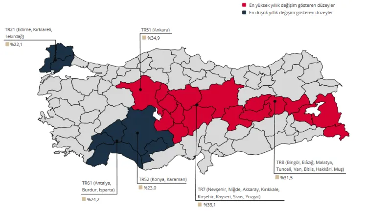İstatistiki Bölge Birimleri Sınıflamasına (İBBS) göre bölgesel yıllık değişimler incelendiğinde, Aralık 2025'te en yüksek yıllık artış yüzde 34,9 ile Ankara bölgesinde gerçekleşti. En düşük yıllık artış ise yüzde 22,1 ile Edirne, Kırklareli ve Tekirdağ'ı kapsayan bölgede kaydedildi.