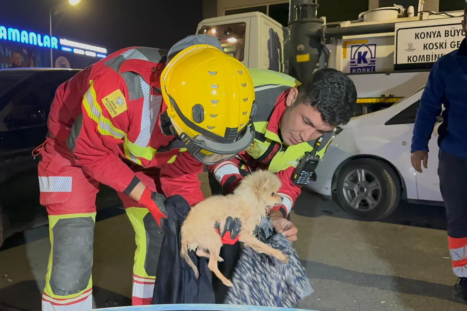 Konya Büyükşehir Belediyesi İtfaiye Dairesi Başkanlığı ve KOSKİ Genel Müdürlüğü ekipleri, kanalizasyon borusuna düşerek mahsur kalan minik köpeği 6 saat süren titiz bir çalışmanın ardından kurtardı.