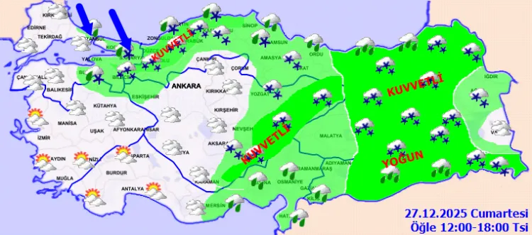 Çok bulutlu, gece saatlerinden itibaren kıyıları kuvvetli yağmur ve karla karışık yağmur, iç ve yüksekleri yoğun kar yağışlı