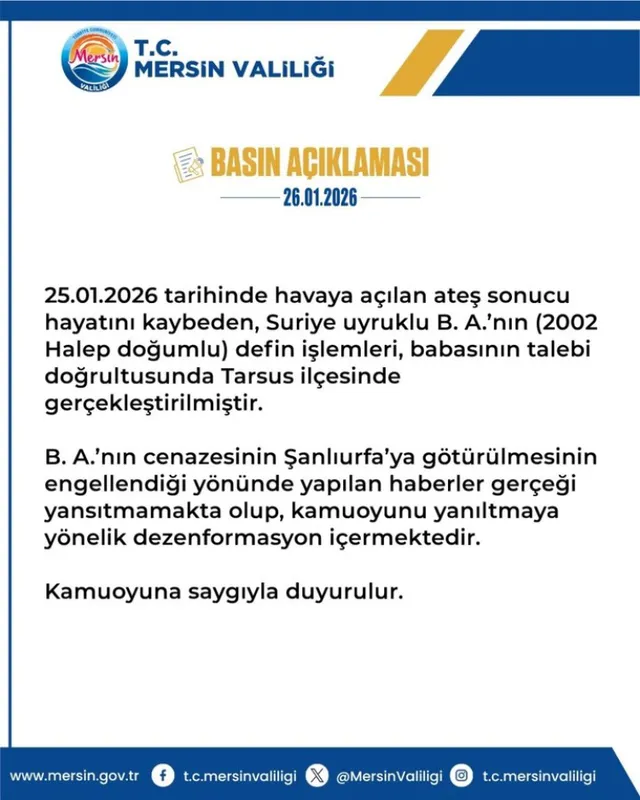 Mersin Valiliği, 25 Ocak 2026'da Tarsus'ta yaşanan olayda hayatını kaybeden Suriye uyruklu B.A.'nın cenazesine ilişkin kamuoyunda yer alan iddiaların gerçeği yansıtmadığını açıkladı.