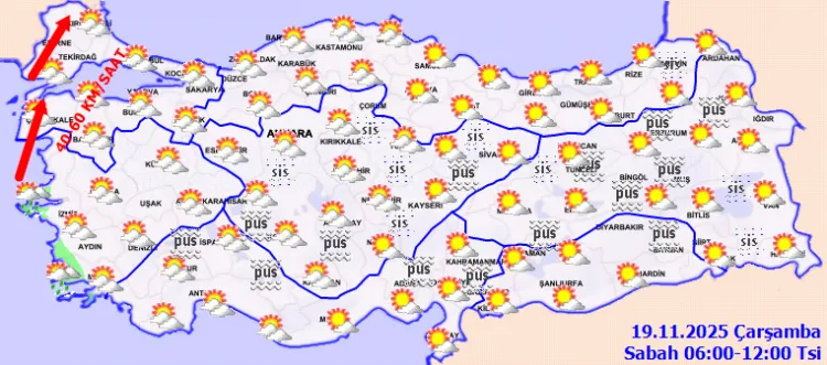 Rüzgar genellikle güney yönlerden hafif, ara sıra orta kuvvette, Marmara'nın batısında güney ve güneybatı yönlerden kuvvetli (40-60 km/saat) olarak esmesi bekleniyor.