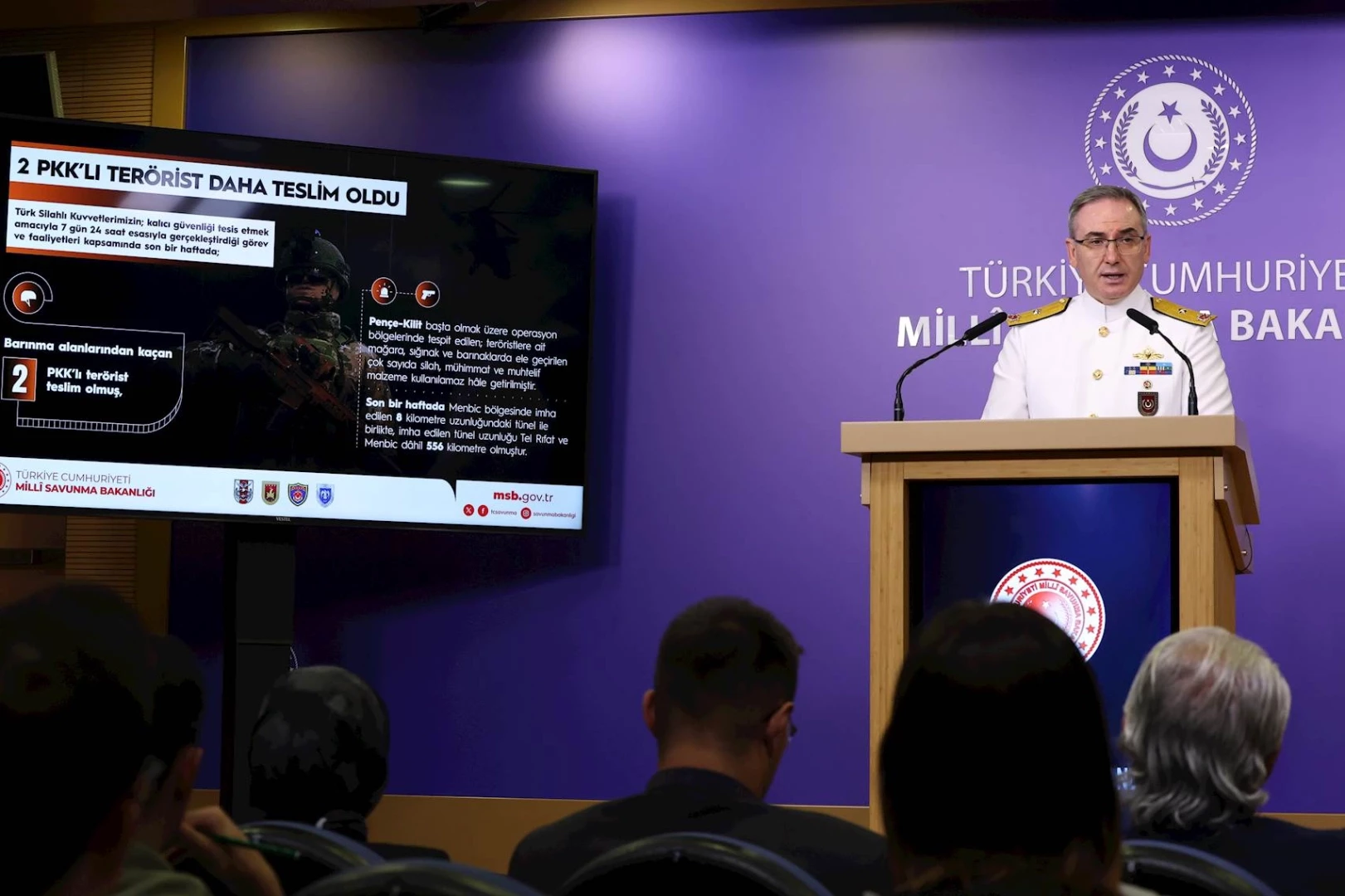 Milli Savunma Bakanlığı, haftalık basın toplantısında, son bir haftada 2 PKK'lı teröristin teslim olduğunu, hudutlarda 395 şahsın yakalandığını ve 166 kilogram uyuşturucu ele geçirildiğini duyurdu. Suriye'de imha edilen tünel uzunluğu ise 556 kilometreye ulaştı.
