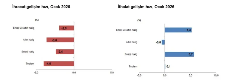 Ocak 2026'da ihracat geçen yılın aynı ayına göre yüzde 4 azalırken, ithalat yüzde 0,1 arttı. Dış ticaret açığı yüzde 11,6 yükselerek 8 milyar 380 milyon dolara çıktı. Veriler, yılın ilk ayında dış ticaret dengesinde zayıflamanın sürdüğünü ortaya koydu.