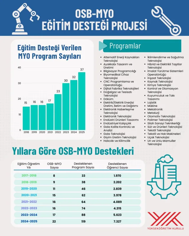 ANKARA (İGFA) - Yüksek Öğretim Kurumu Başkanı Erol Özvar, Organize Sanayi Bölgeleri Meslek Yüksekokulları (OSB-MYO) modeline ilişkin 2025 yılı infografik verilerini kamuoyuyla paylaştı. Özvar, mesleki eğitimi doğrudan üretimle buluşturan modelin her geçen yıl daha da güçlendiğini duyurdu.