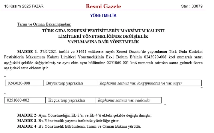 Bugünkü Resmi Gazete'de yayımlanan yönetmelik değişikliğiyle Türk Gıda Kodeksi Pestisitlerin Maksimum Kalıntı Limitleri Yönetmeliği'nde turp yaprakları için düzenlemeler yapıldı. Büyük ve küçük turp yaprakları ile ilgili kodlar eklenirken, Ek-2 ve Ek-4 tabloları revize edildi, gıda güvenliği standartları yükseltildi.