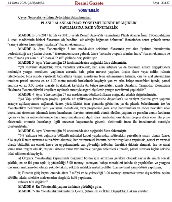 Yapılan düzenlemelerle otopark, yangın merdiveni, yapı aplikasyon projeleri ve bazı ruhsata tabi olmayan uygulamalara ilişkin önemli değişiklikler getirildi.