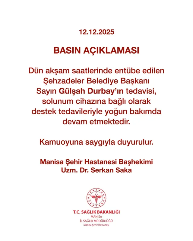 Manisa Şehir Hastanesi'nden yapılan açıklamaya göre, entübe edilen Şehzadeler Belediye Başkanı Gülşah Durbay'ın tedavisi yoğun bakımda devam ediyor.