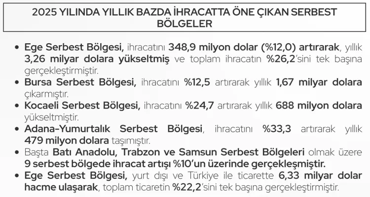 İhracatta öne çıkan serbest bölgeler arasında Ege Serbest Bölgesi, 3,26 milyar dolarlık ihracatla ilk sırada yer aldı. Bölge, toplam ihracatın yüzde 26,2'sini tek başına gerçekleştirdi. Bursa Serbest Bölgesi 1,67 milyar dolar, Kocaeli Serbest Bölgesi 688 milyon dolar ve Adana-Yumurtalık Serbest Bölgesi ise 479 milyon dolarlık ihracata ulaştı. Dokuz serbest bölgede ihracat artışı yüzde 10'un üzerinde gerçekleşti.