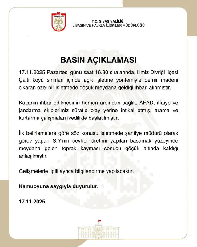 İlk tespitlere göre, şantiye müdürü olarak görev yapan S.Y., cevher üretimi sırasında basamak yüzeyinde yaşanan toprak kayması sonucu göçük altında kaldı.